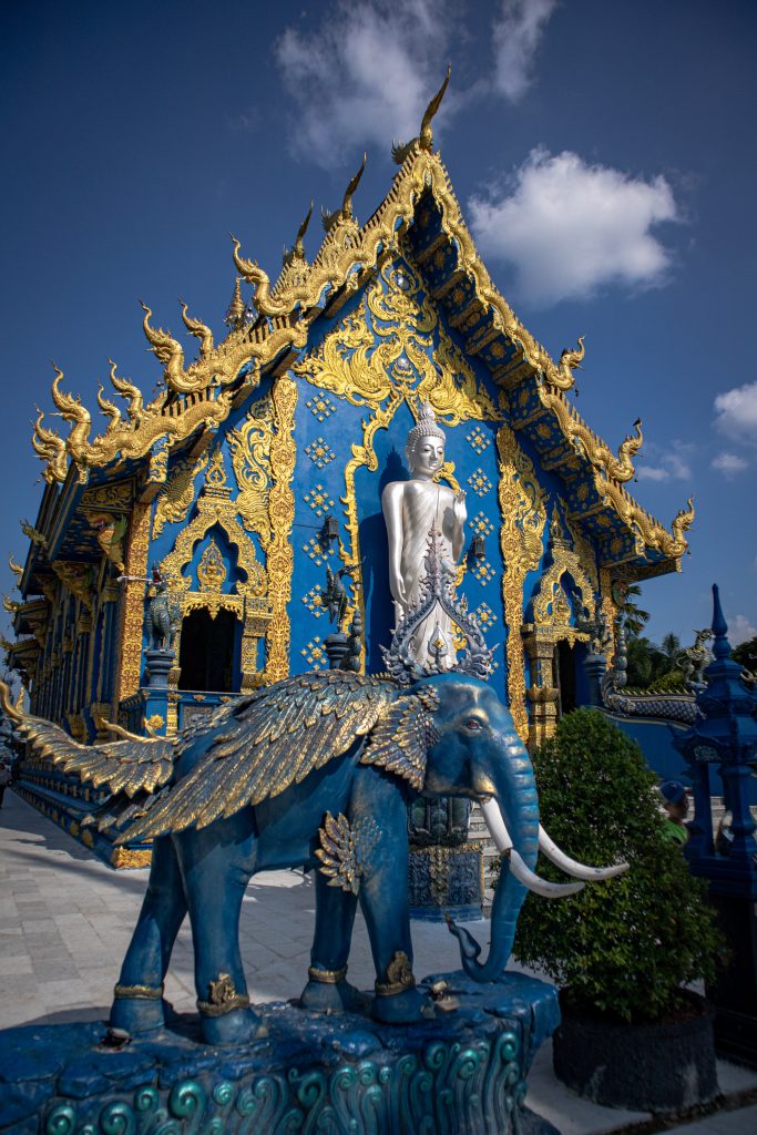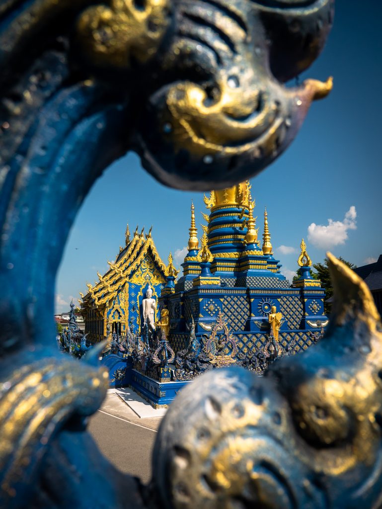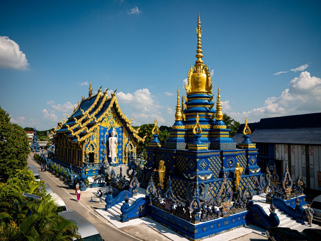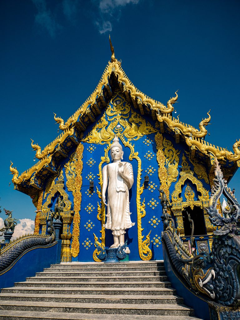 • Temple Bleu (Wat Rong Suea Ten) : plus petit mais tout aussi impressionnant avec ses nuances de bleu électrique et d’or. L’ambiance est plus calme que le Temple Blanc, ce qui laisse le temps d’observer les détails et la grande statue de Bouddha blanche à l’intérieur. Compte environ 1 heure de visite.