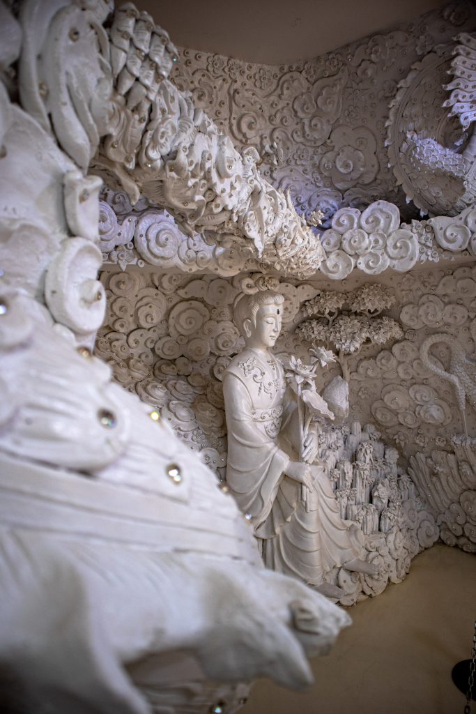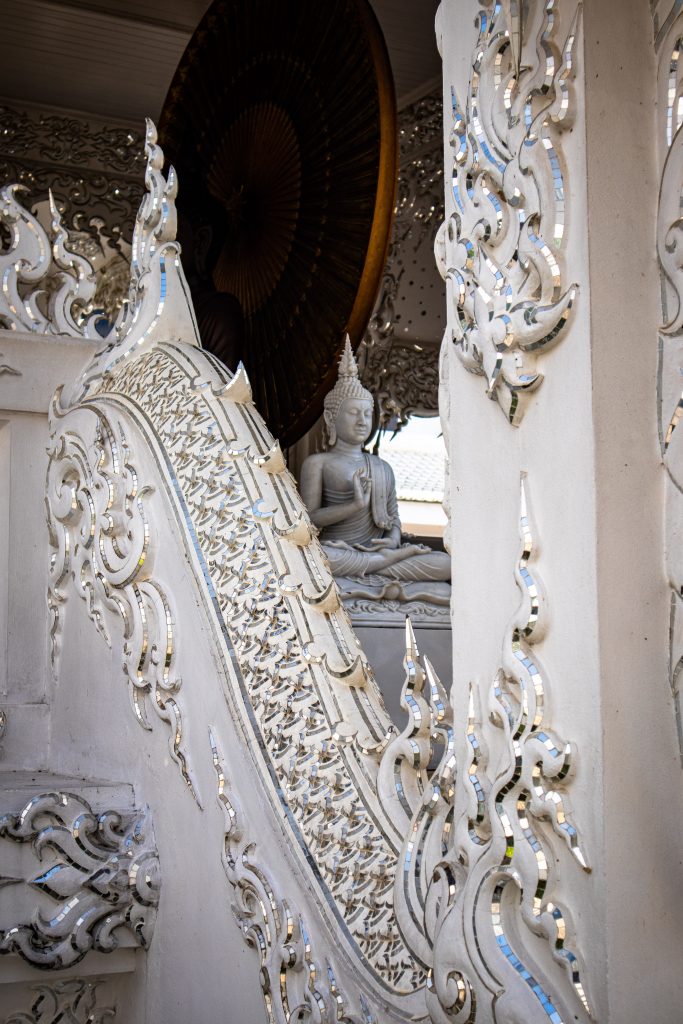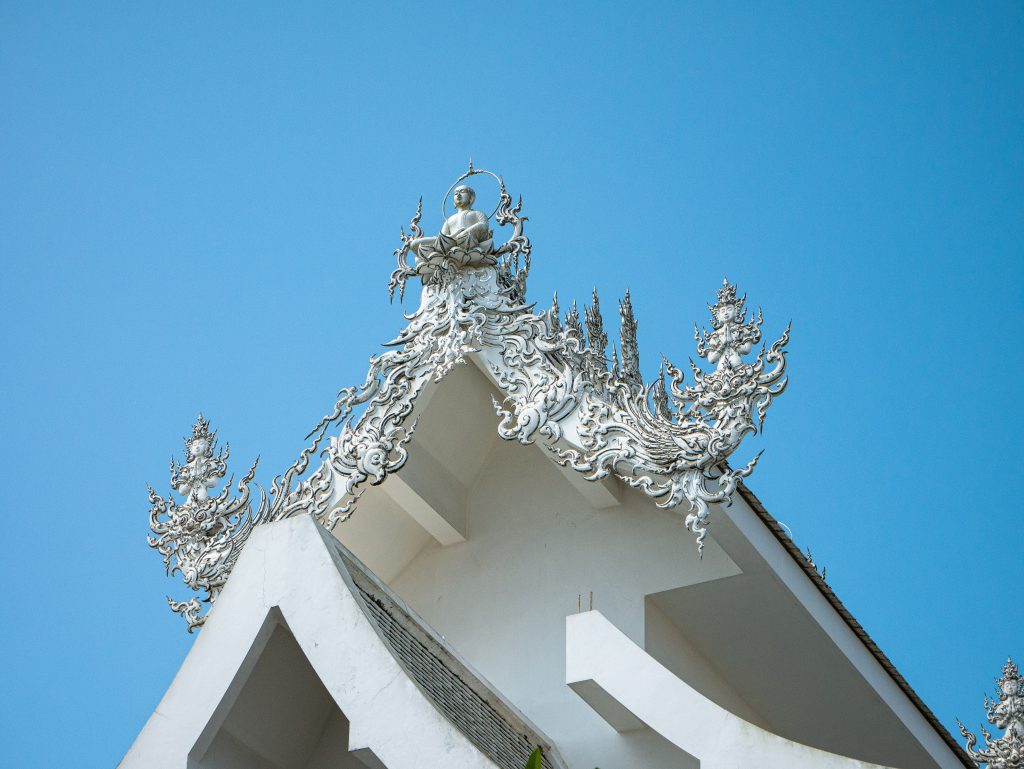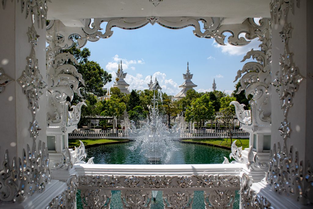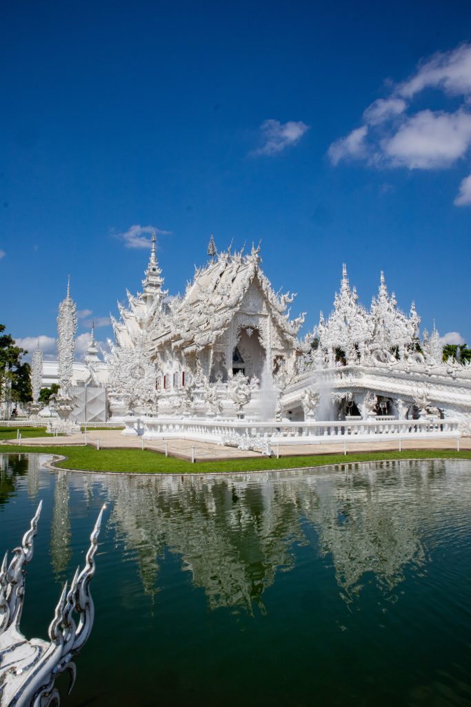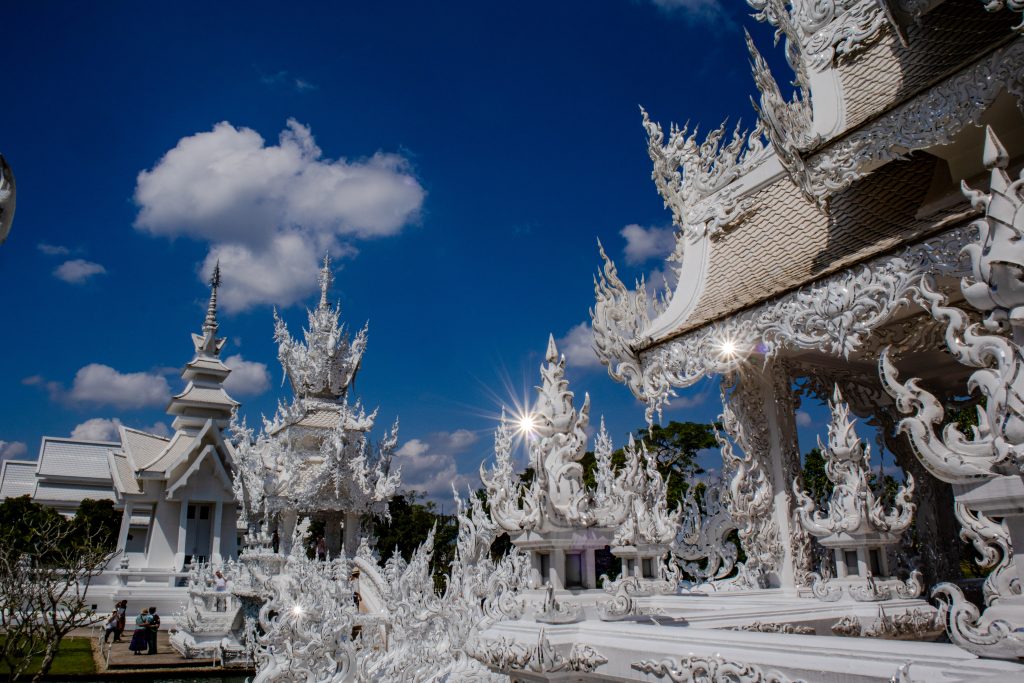 • Temple Blanc (Wat Rong Khun) : véritable claque visuelle, tout en blanc avec des éclats de miroirs qui brillent au soleil. L’architecture est très particulière, presque surréaliste, et l’intérieur mêle art moderne et symboles bouddhistes. Prévois environ 2 heures sur place pour vraiment en profiter.