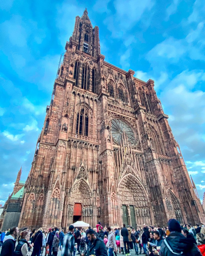 Dominant fièrement le panorama strasbourgeois, la Cathédrale Notre-Dame de Strasbourg est une merveille gothique a visiter tout au long de l’année, et encore plus pendant les fêtes de fin d’année. Ornée de détails sculpturaux impressionnants, elle offre une vue à couper le souffle sur la ville. Tu peux visiter l’intérieur gratuitement et monter ses 332 marches pour admirer la vue sur la ville depuis sa plateforme pour 8€ seulement. L’expérience et le panorama en vaut vraiment le coup. Par contre, attention, il y a souvent beaucoup de queue pour l’un comme pour l’autre.
